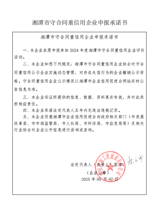 本企業(yè)根據(jù)《湘潭市守合同重信用企業(yè)申報規(guī)定》等編制 2024 年度企業(yè)信用報告書,并保證本報告書內(nèi)容真實、準確、完整。
