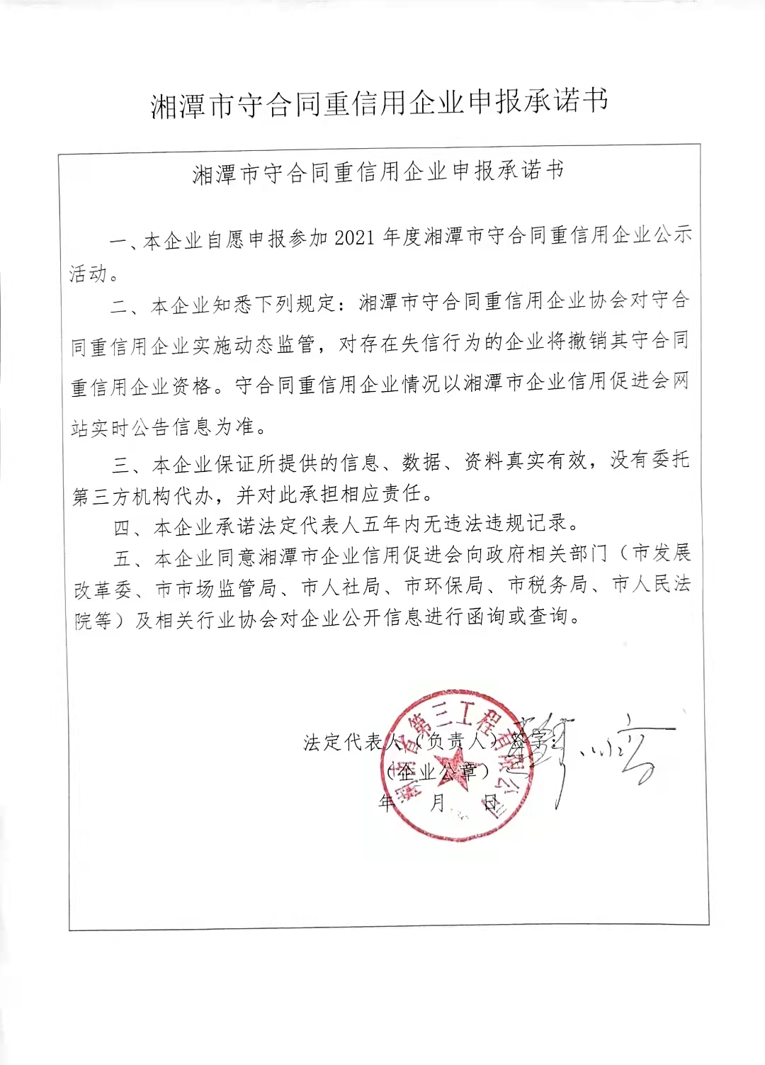 本企業(yè)根據(jù)《湘潭市守合同重信用企業(yè)申報(bào)規(guī)定》等編制 2021 年度企業(yè)信用報(bào)告書(shū),并保證本報(bào)告書(shū)內(nèi)容真實(shí)、準(zhǔn)確、完整。