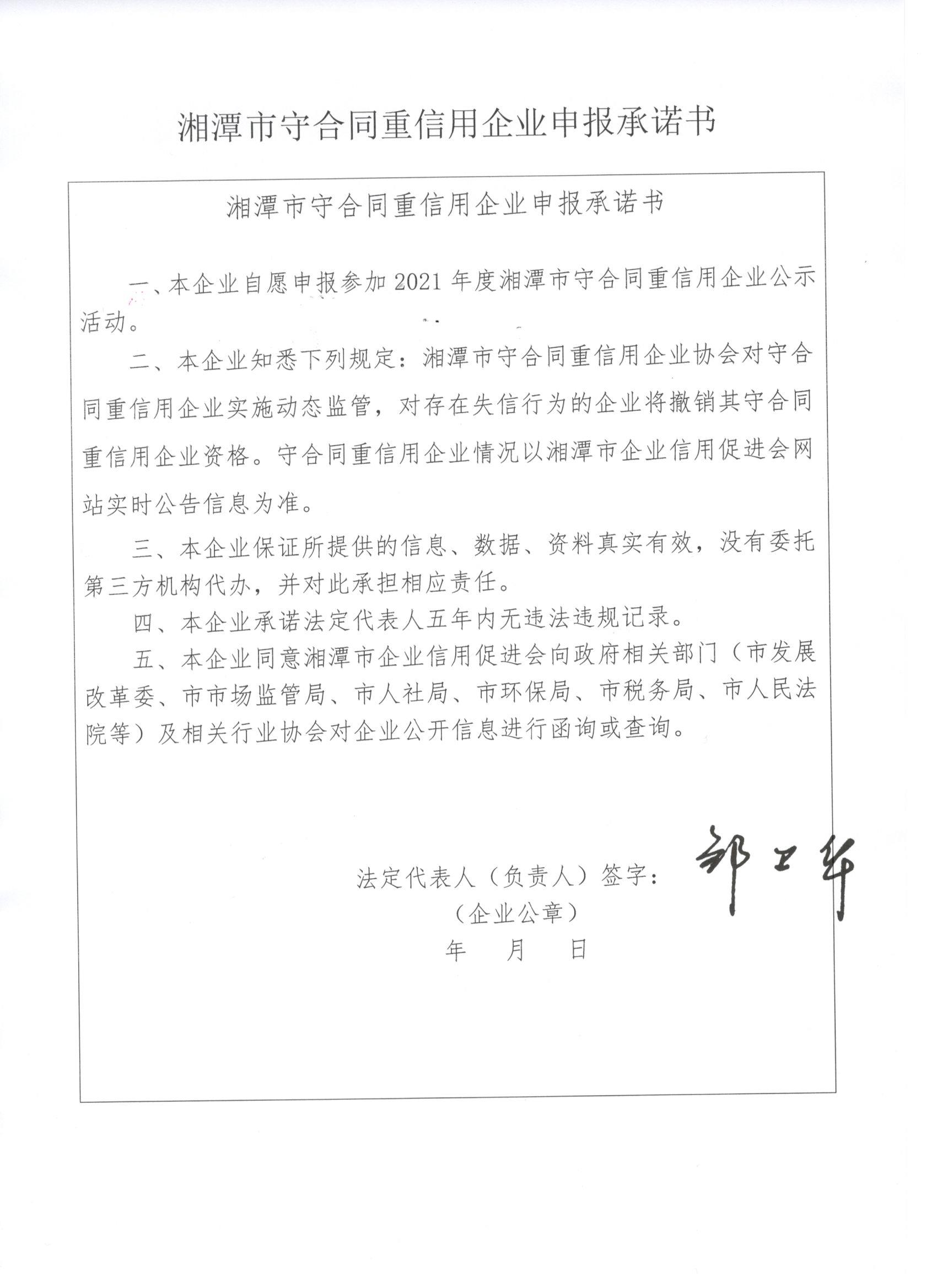 本企業(yè)根據(jù)《湘潭市守合同重信用企業(yè)申報規(guī)定》等編制 2021 年度企業(yè)信用報告書,并保證本報告書內(nèi)容真實、準確、完整。