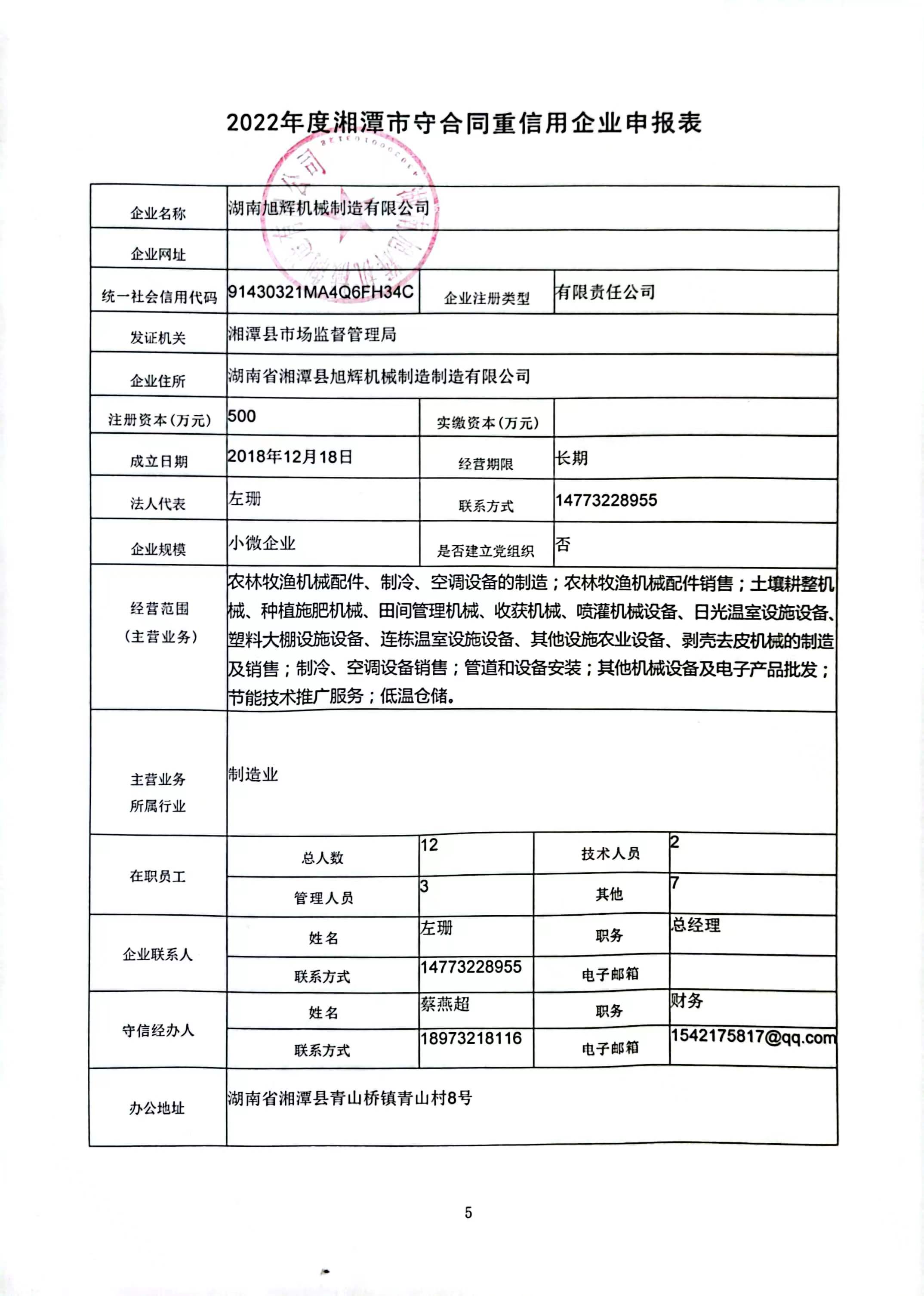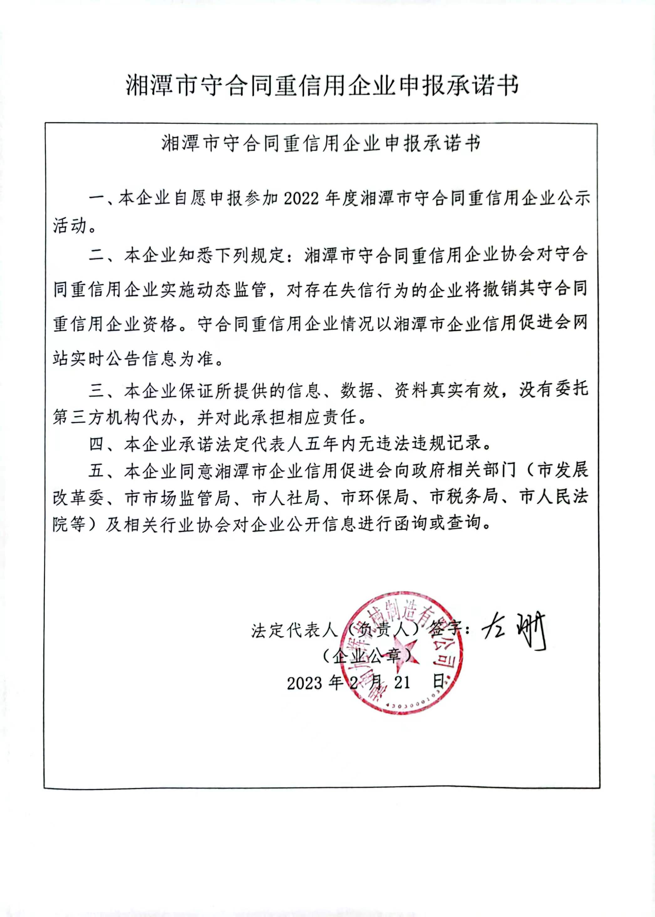 本企業(yè)根據(jù)《湘潭市守合同重信用企業(yè)申報(bào)規(guī)定》等編制 2022 年度企業(yè)信用報(bào)告書(shū),并保證本報(bào)告書(shū)內(nèi)容真實(shí)、準(zhǔn)確、完整。