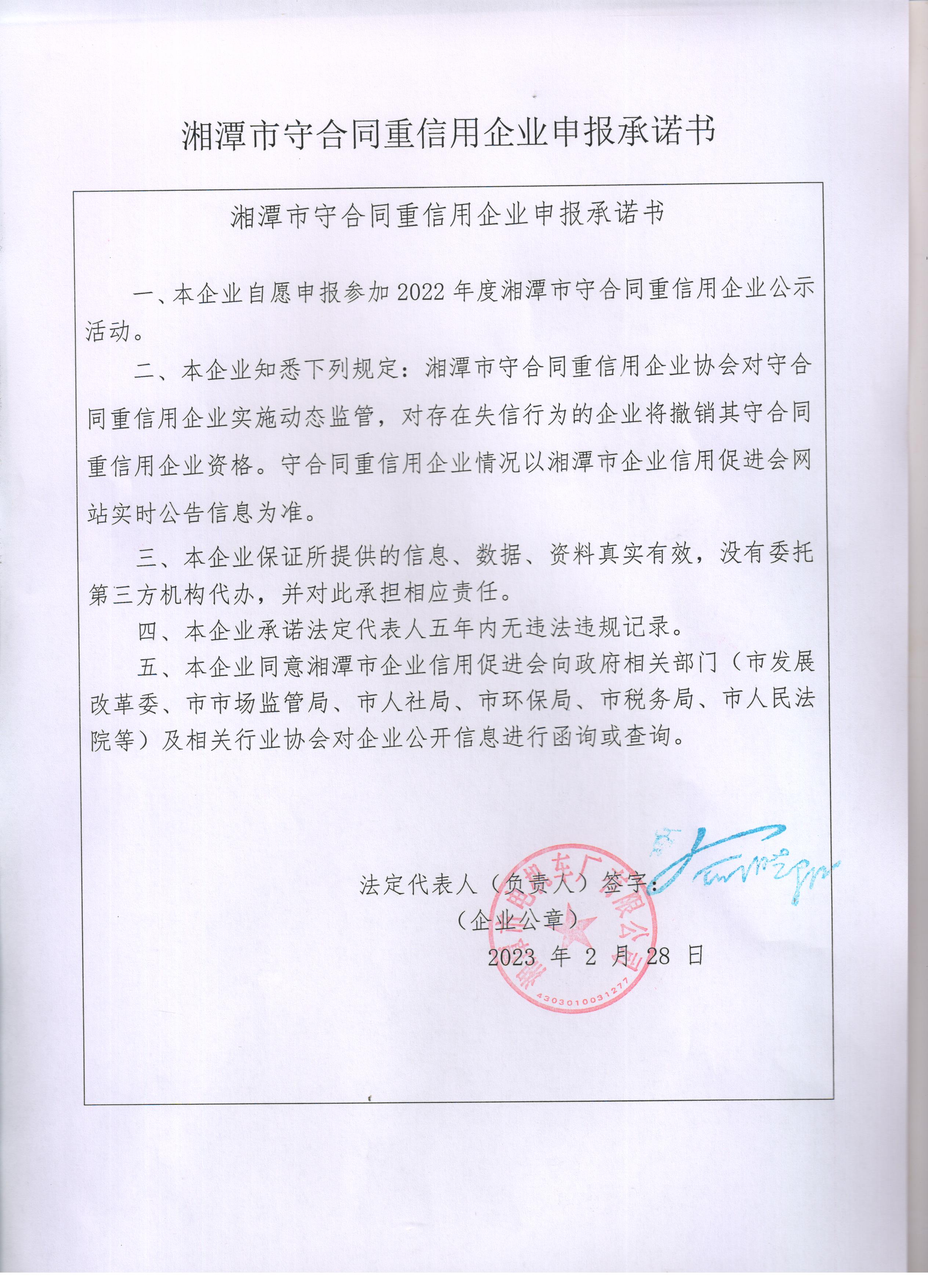 本企業(yè)根據(jù)《湘潭市守合同重信用企業(yè)申報(bào)規(guī)定》等編制 2022 年度企業(yè)信用報(bào)告書,并保證本報(bào)告書內(nèi)容真實(shí)、準(zhǔn)確、完整。