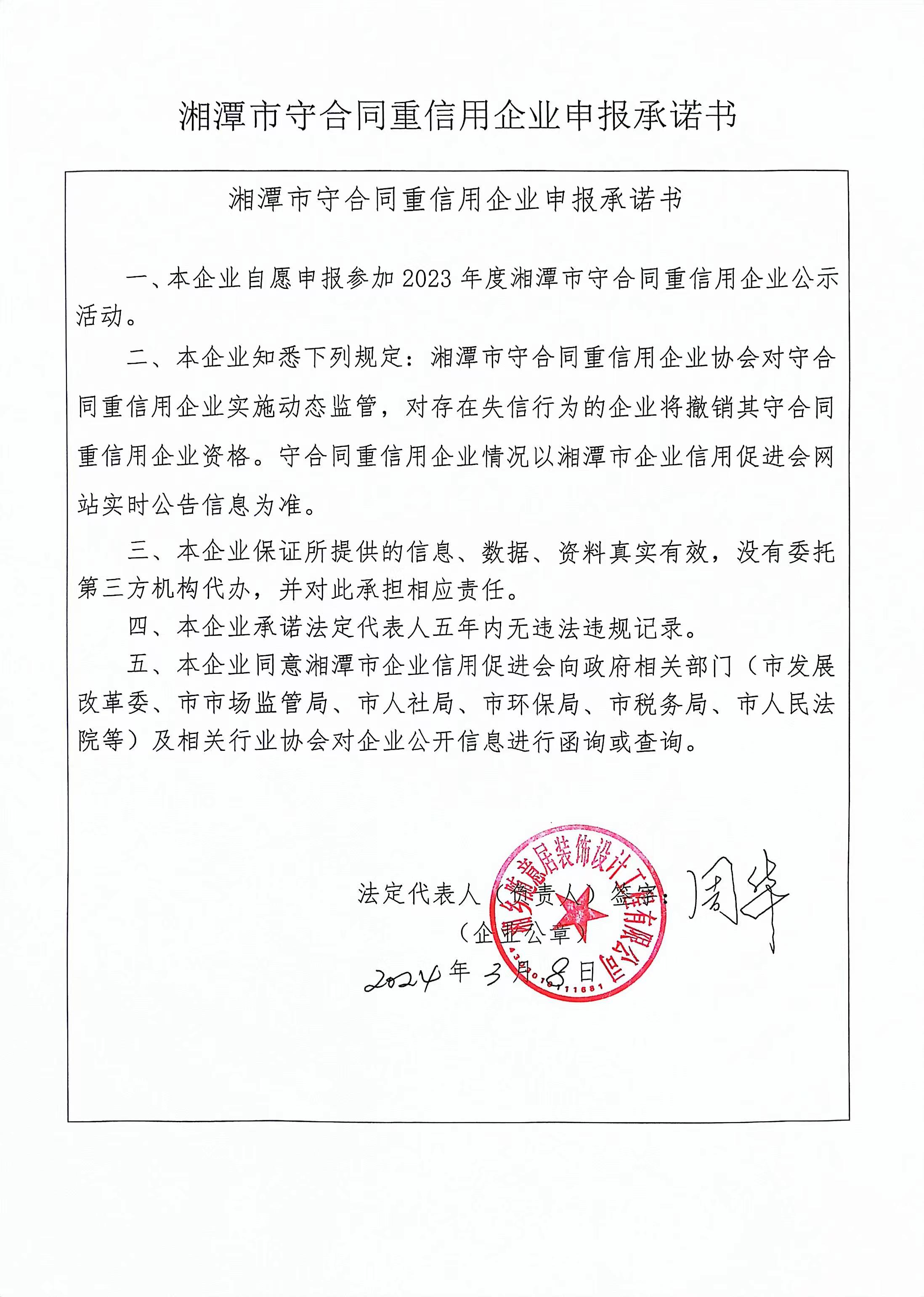 本企業(yè)根據(jù)《湘潭市守合同重信用企業(yè)申報(bào)規(guī)定》等編制 2023 年度企業(yè)信用報(bào)告書,并保證本報(bào)告書內(nèi)容真實(shí)、準(zhǔn)確、完整。